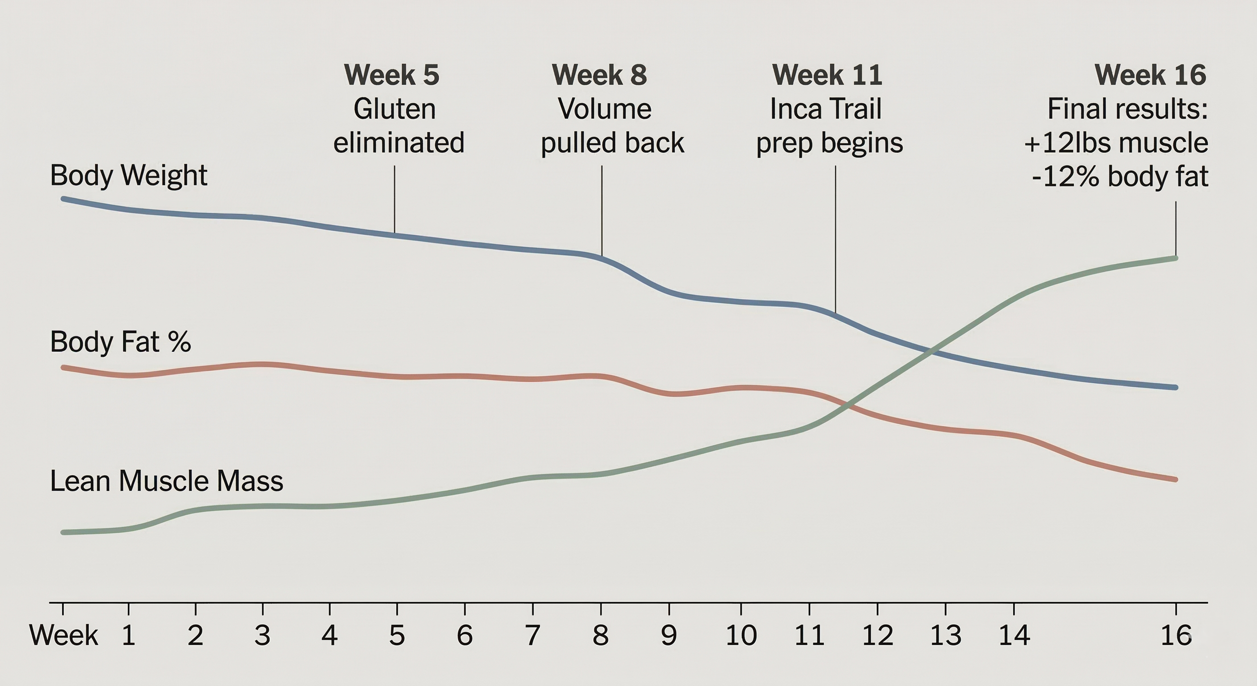 16 weeks later: 12 pounds of lean muscle, 12% body fat lost, and a completed Inca Trail in Peru. Something he knew for a fact, the pre-program version of himself wouldn't have survived without injury. Here's what actually changed.